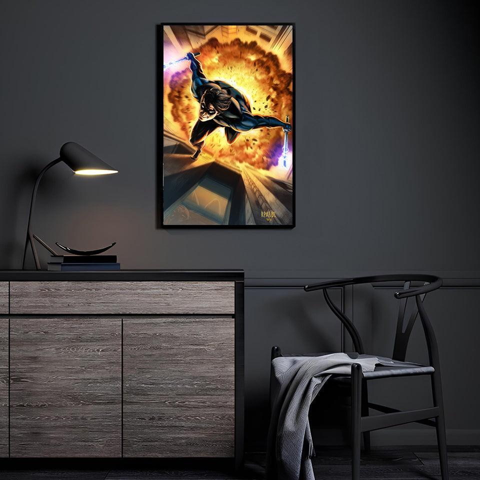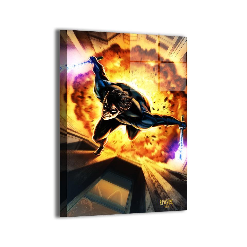 Blazing Descent captures Nightwing in full aerial descent — explosion ripping through the skyline behind him as glowing blue escrima... Read more