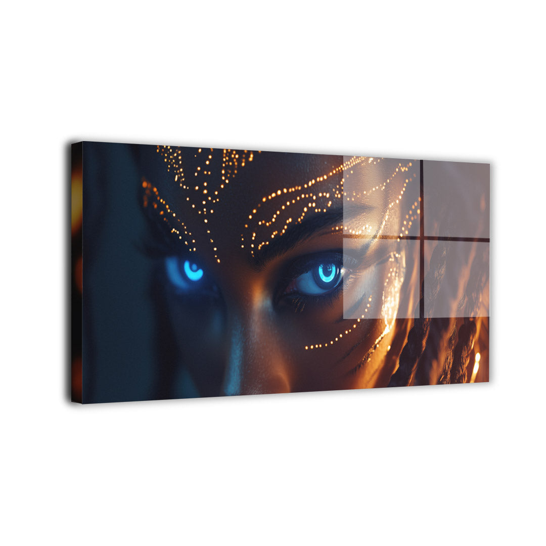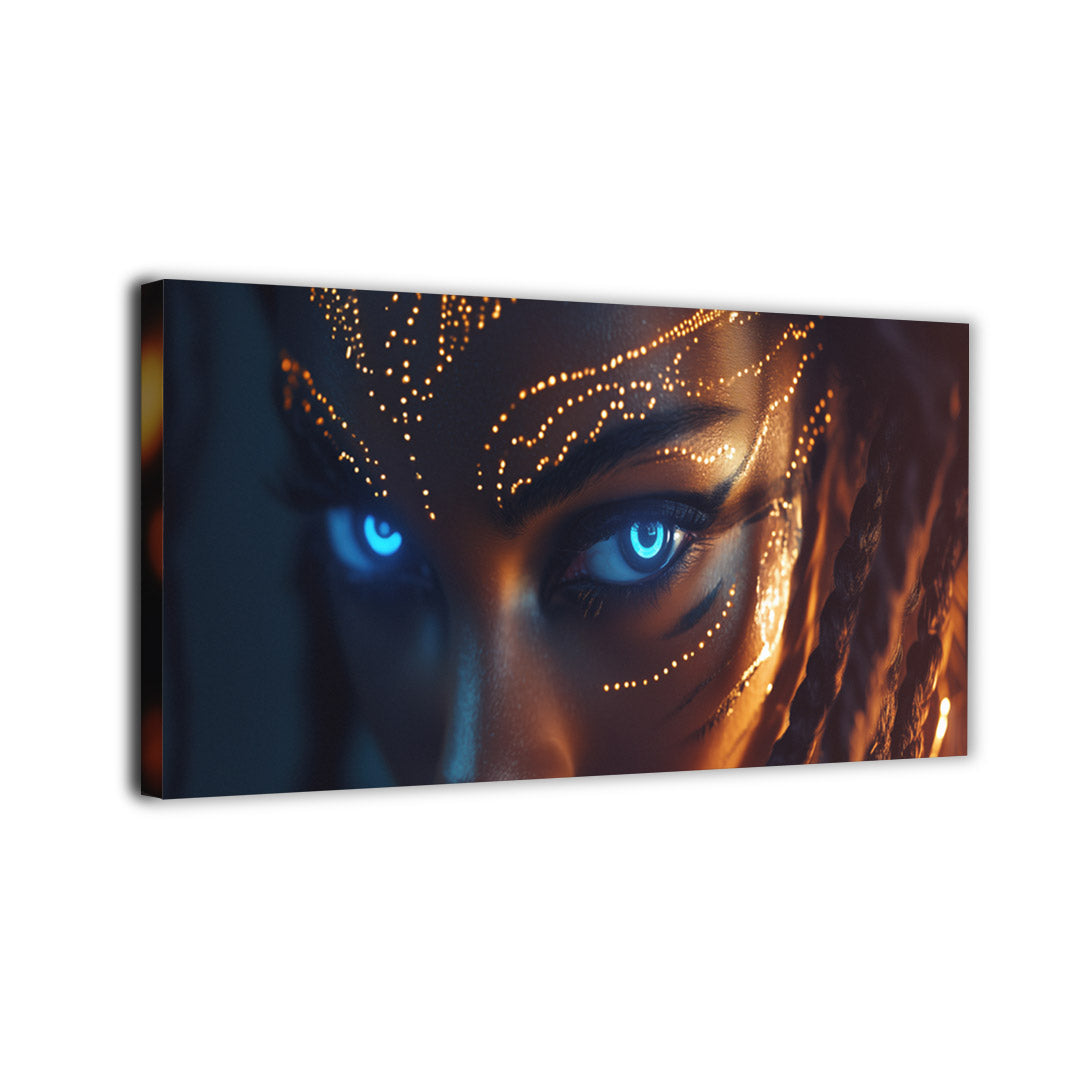 Peer into the soul of the future as glowing blue cybernetic eyes framed by radiant tribal circuitry blend ancient symbolism... Read more