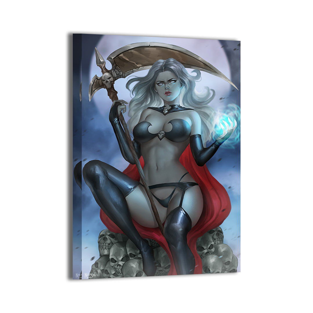 Born of darkness and vengeance, Lady Death reigns over the underworld with cold beauty and merciless resolve. Her silver hair gleams beneath the blood-moon sky, scythe poised to reap the souls of the fallen as her necrotic power ignites the night around her.