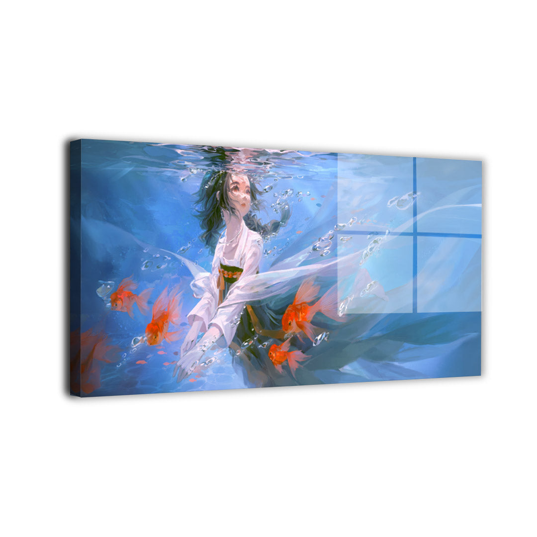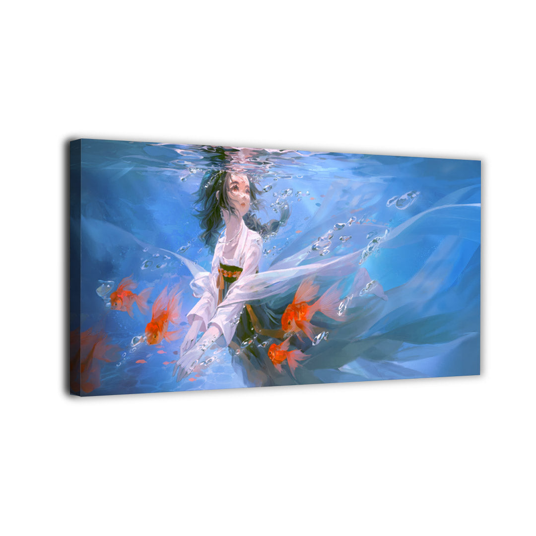 The central figure drifts in dreamlike underwater stillness as flowing fabric, curious goldfish, and shimmering bubbles surround an anime-inspired muse... Read more