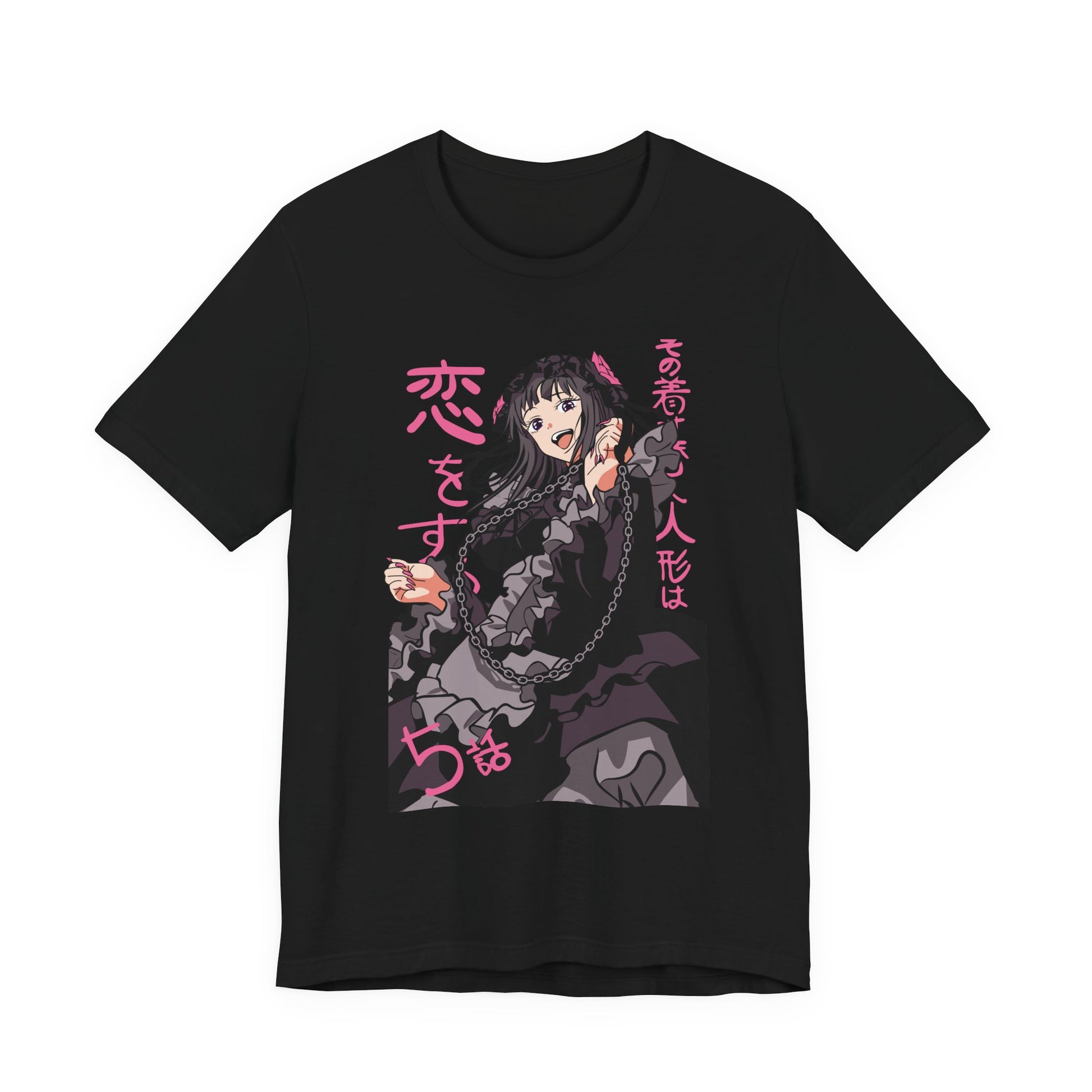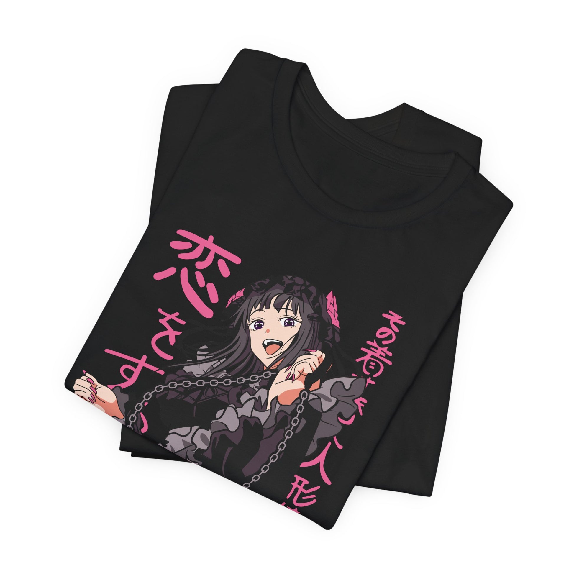 The combination of bold Japanese text and expressive illustration makes this shirt an instant statement piece for anime and cosplay fans alike.