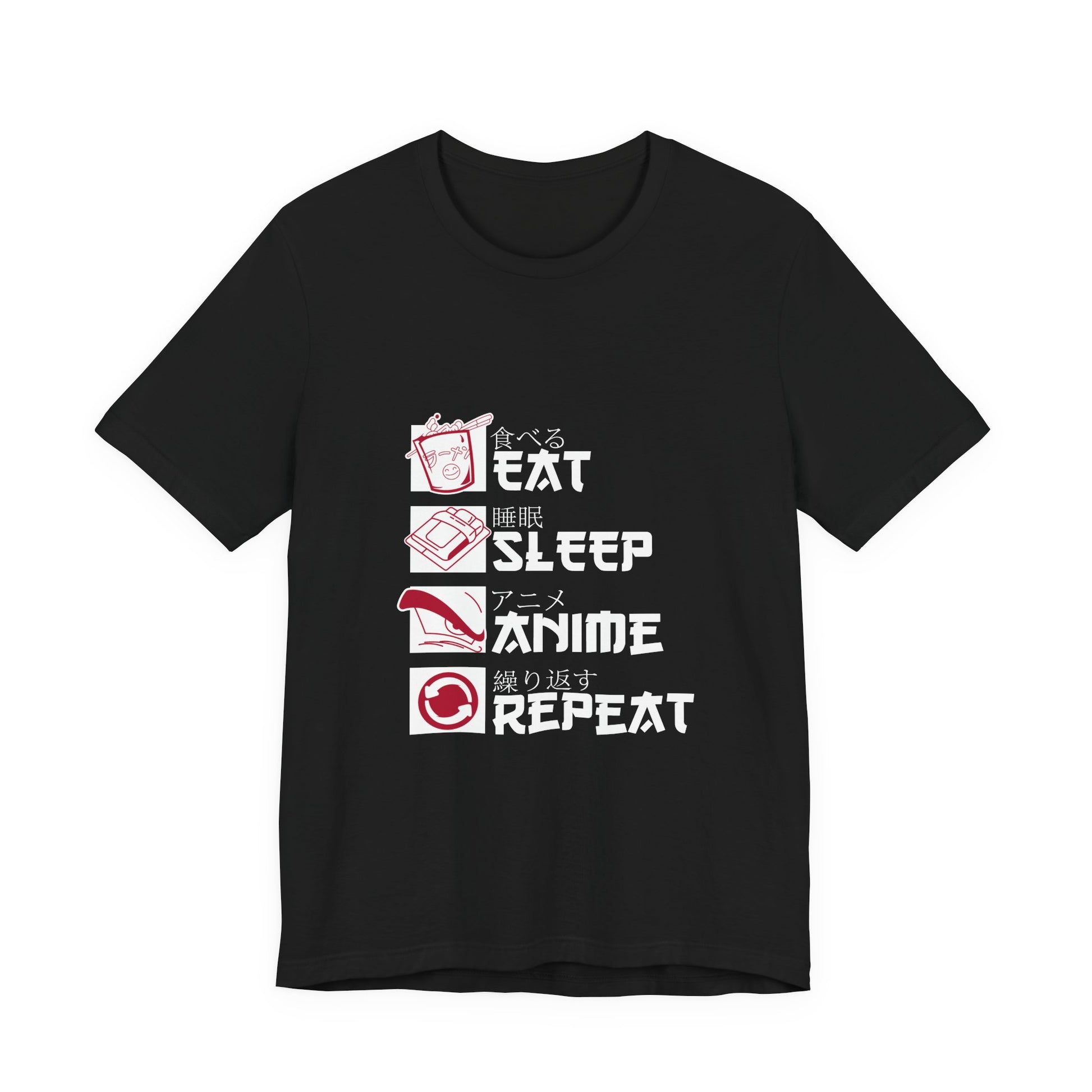 The Otaku Routine Shirt celebrates the universal truth every anime fan lives by — Eat, Sleep, Anime, Repeat. Featuring clean Japanese text, bold graphics, and a modern layout, this design perfectly blends humor and otaku culture into one wearable statement.