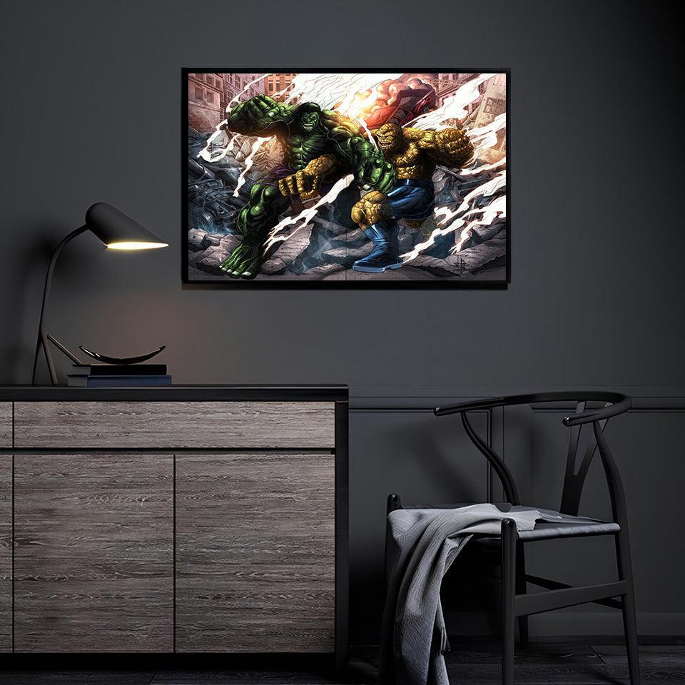 Witness the ultimate clash of titans as the Incredible Hulk and The Thing collide mid-punch in a crumbling cityscape, two... Read more