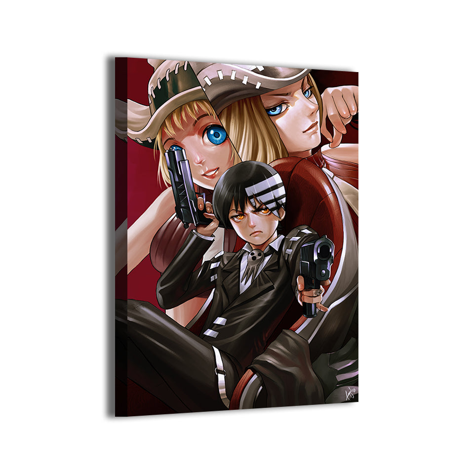 Step into a world of order, style, and supernatural firepower with Symmetry Enforcer Wall Art, a striking anime piece starring Death the Kid and his trusty weapons, Liz and Patty Thompson. This electrifying trio from Soul Eater is captured mid-action in this dynamic artwork by Ceasar, reflecting Kid’s iconic obsession with symmetry and the sisters’ cool, confident power.