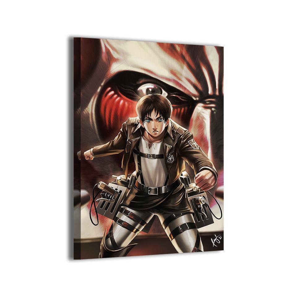 Eren Yeager captured mid-charge—a fierce, determined Scout Commander propelling forward with ODM gear primed and the Colossal Titan looming behind... Read more